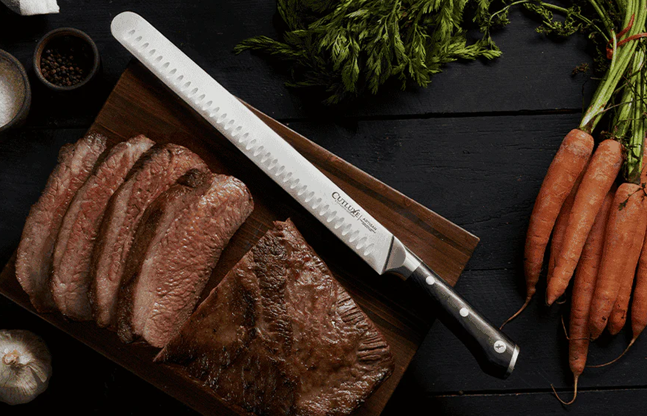 Our favorite is this 12-inch beauty from Cutluxe and you need to add it to your collection in the kitchen. It has a full-tang design with a Rockwell hardness that falls comfortably above 56. It cuts through meat with a high level of consistency and precision.