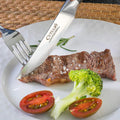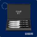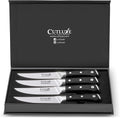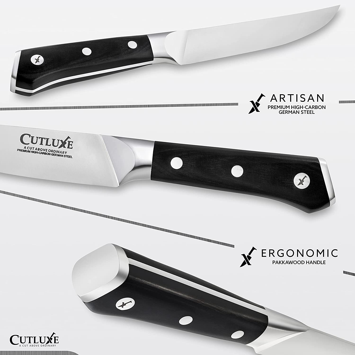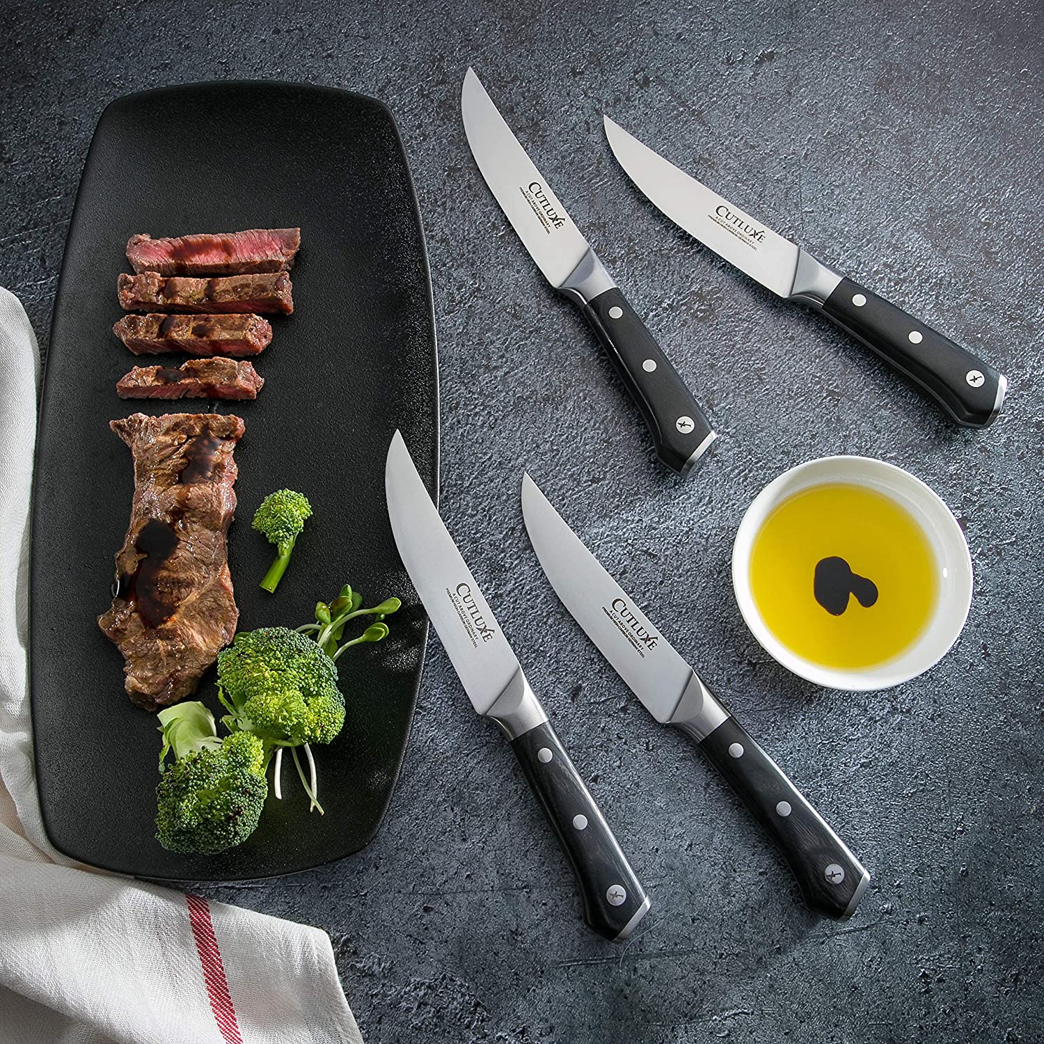4 piece steak knife set with triple-riveted luxurious pakkawood handle, imported high carbon German steel, full tang construction and 5-Inch razor-sharp straight blade edge for effortless and precise slicing.