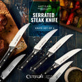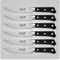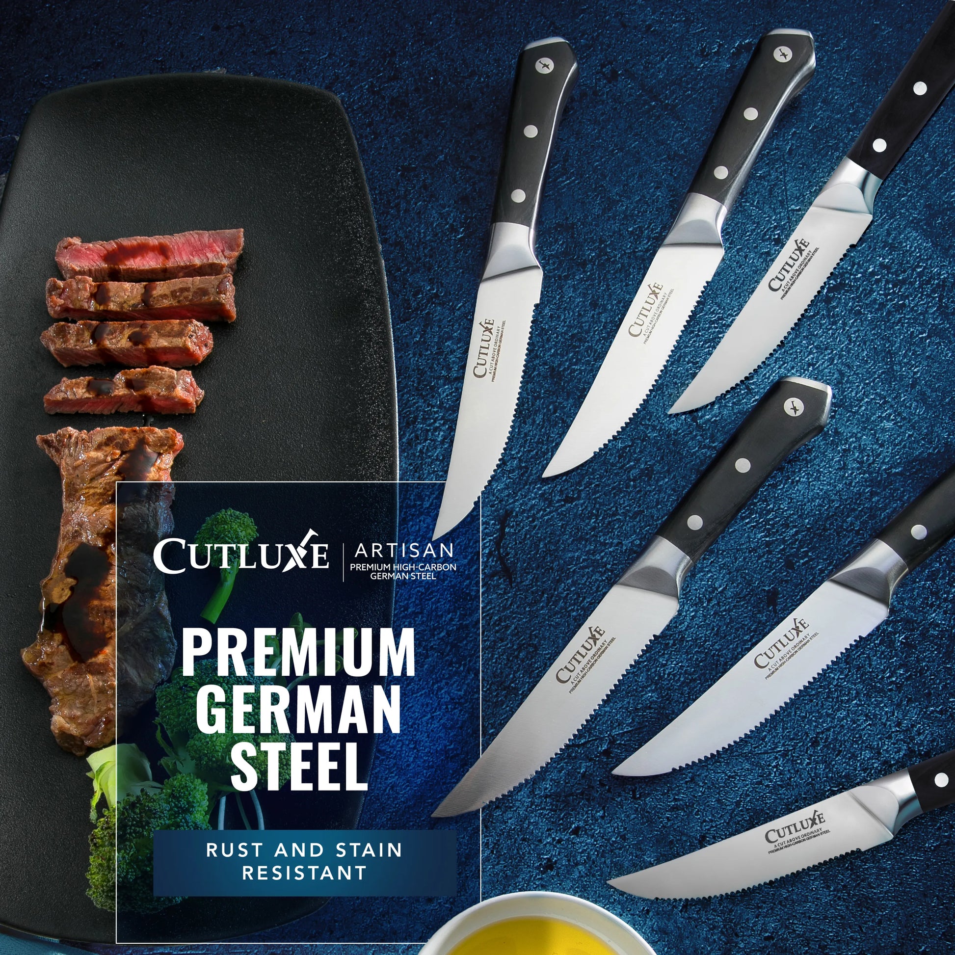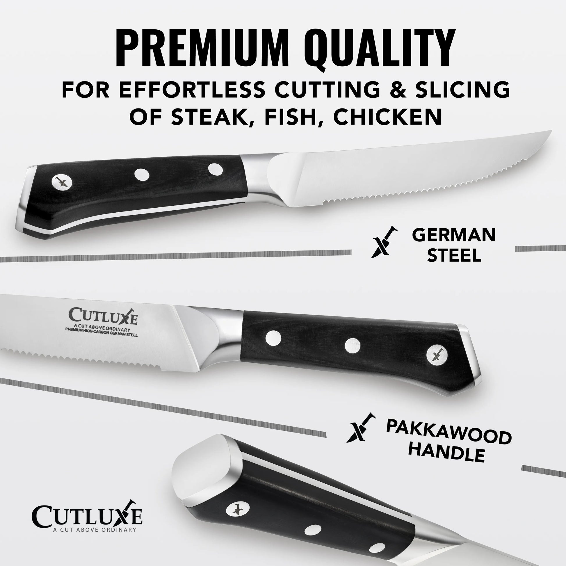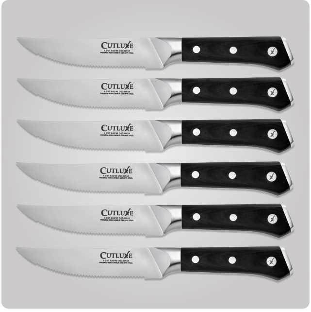 The Cutluxe Steak Knives Set of 6 is perfect for enjoying your favorite steaks with ease and precision. Each serrated steak knife features a high-carbon, stainless steel blade designed to effortlessly cut through meat, providing clean, even slices every time. This set of six ensures you have the ideal tools for any dining occasion, whether a casual meal or a gourmet feast.