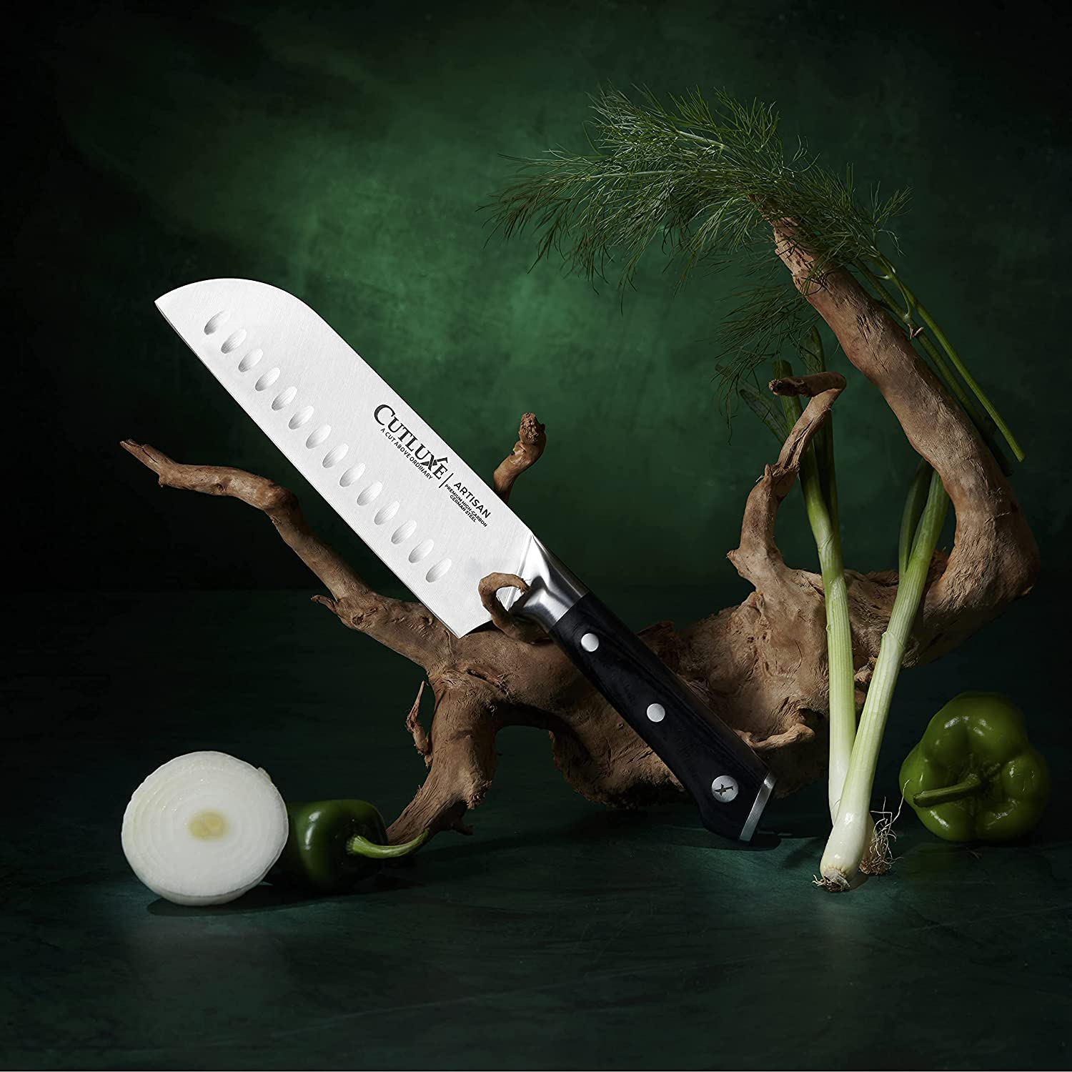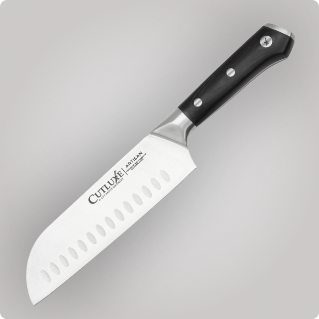 The Santoku kitchen knives versatile design provides excellent control when dicing, mincing, or slicing vegetables, poultry, roasts, and more. Its granton edge features grooves that fill with fat and juices when slicing through meat, allowing more contact between the food and the blade for fast, easy cutting.