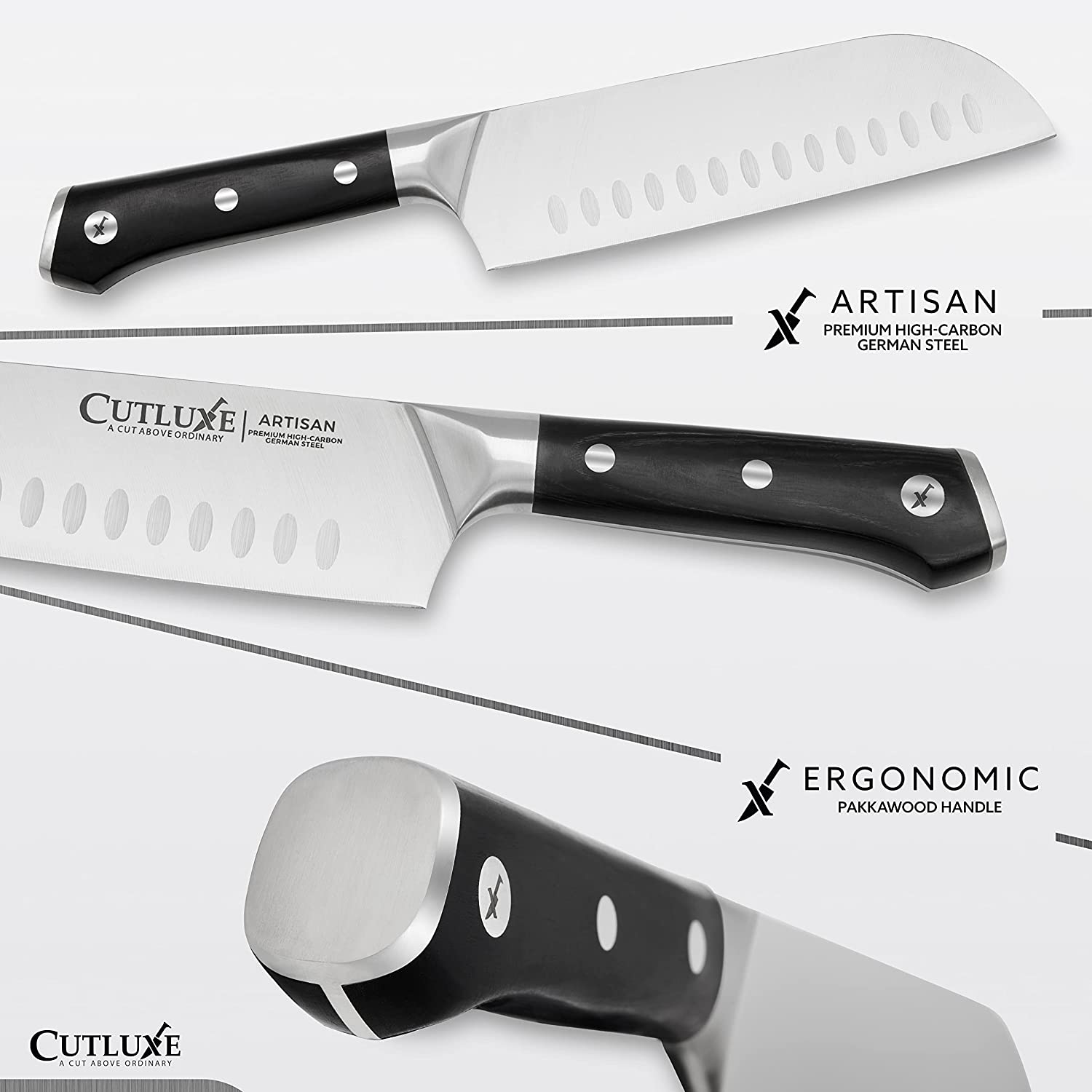 The Cutluxe 7'' Santoku Knife is expertly sharpened and crafted from superior quality stainless steel, ensuring a precise and even cut. It is an all-purpose kitchen knife. The name literally means "three uses": cutting, slicing and chopping.