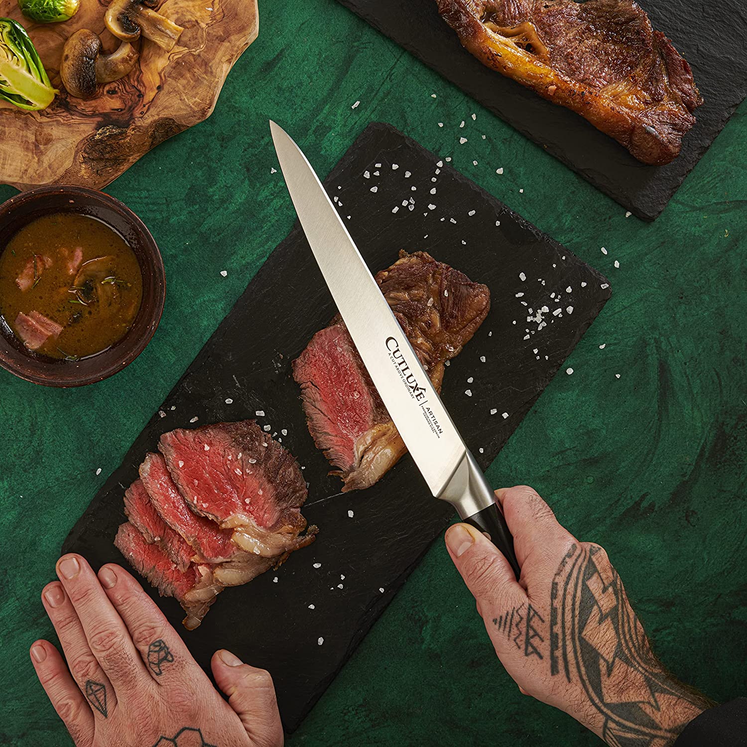 Perfectly engineered slicing knife tapered to a razor-sharp edge for effortless carving and slicing of roast, beef, pork, poultry as well other larger fruits and vegetables.