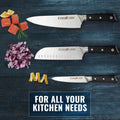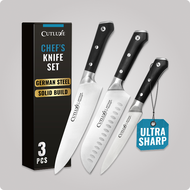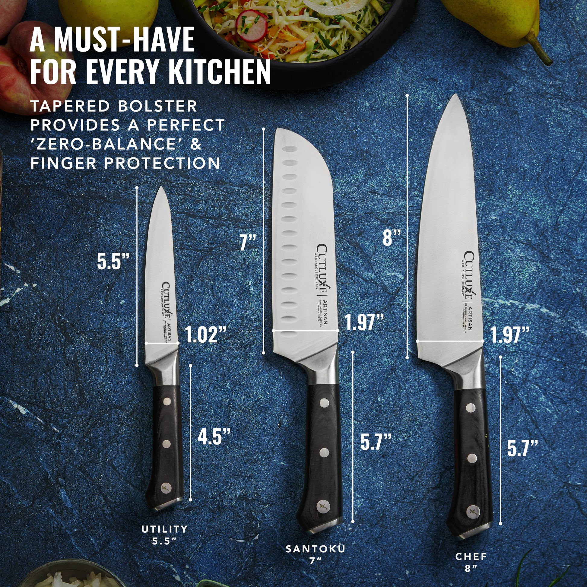 Master every meal with the Cutluxe 3-Piece Chef Knife Set. This set includes an 8” Chef Knife for slicing and chopping, a 7” Santoku Knife for precise cuts, and a 5.5” Utility Knife for smaller tasks – the perfect trio for any kitchen. Crafted from high-carbon German stainless steel, these knives offer razor-sharp edges and long-lasting durability. The full-tang construction and ergonomic pakkawood handles provide superior balance and comfort, giving you total control with every cut. Professional quality at a price that makes sense.